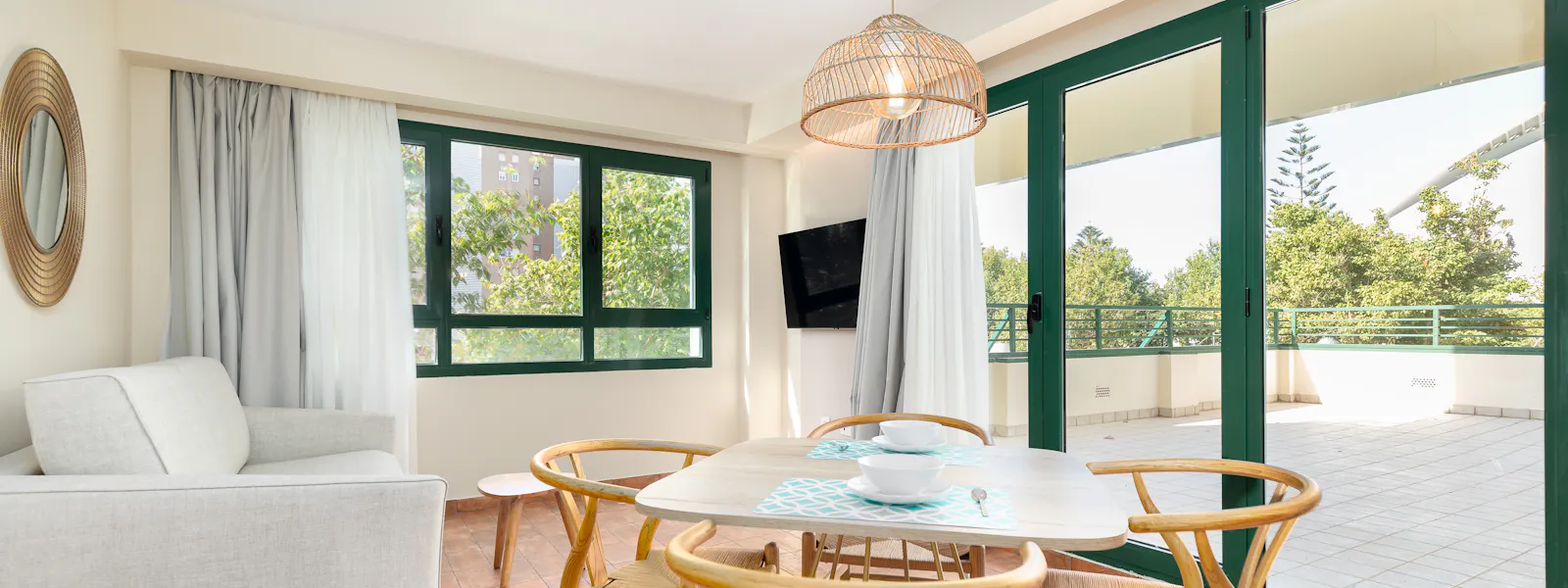- Living-dining room with 140x190cm double sofa bed, dining table, HD-TV Smart TV and exit to terrace.
