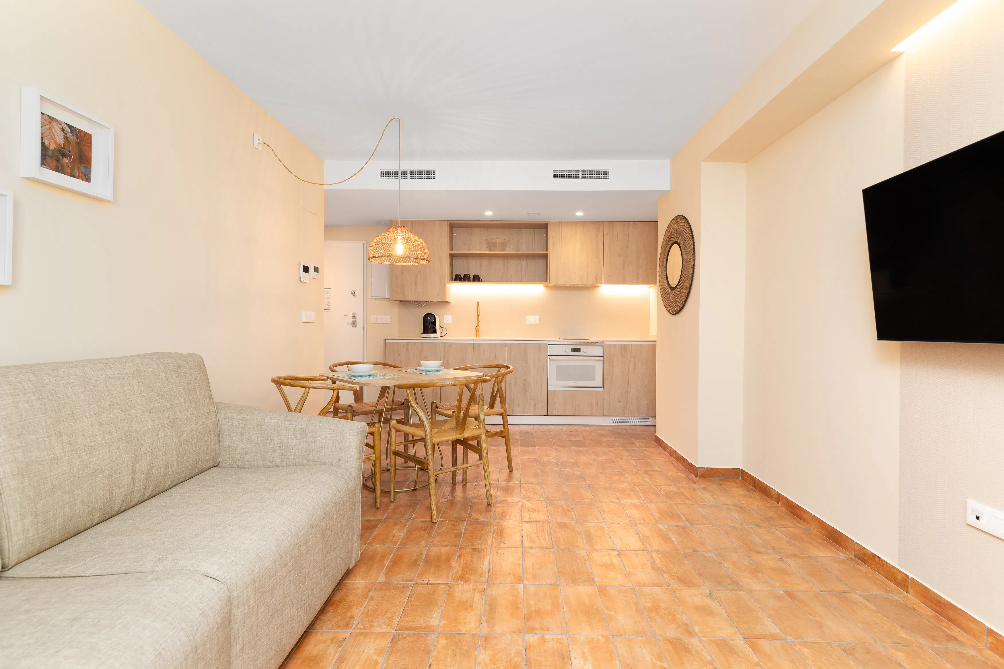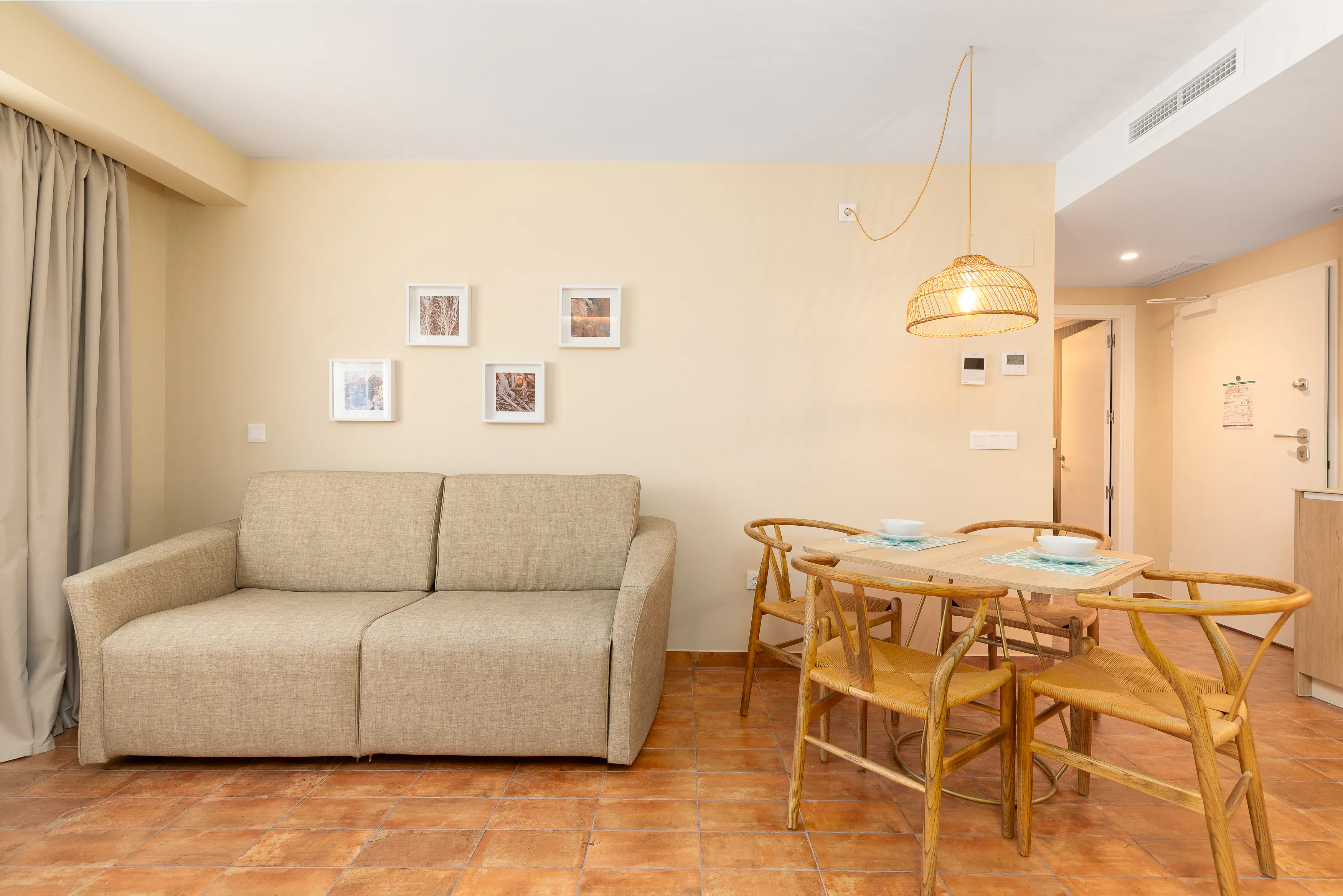 - Living-dining room with a 140x190cm double sofa-bed, dining table, TV-HD Smart TV.
