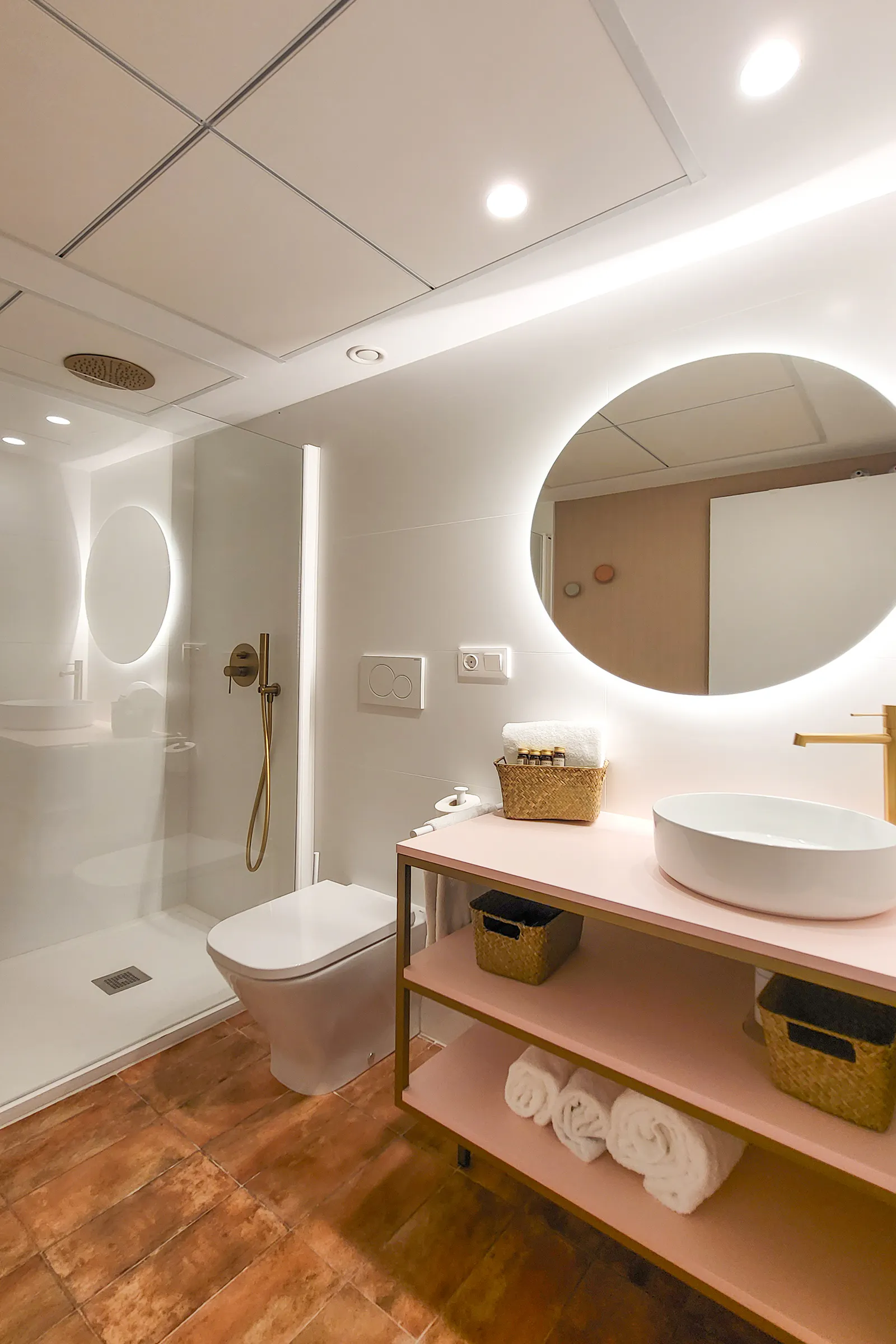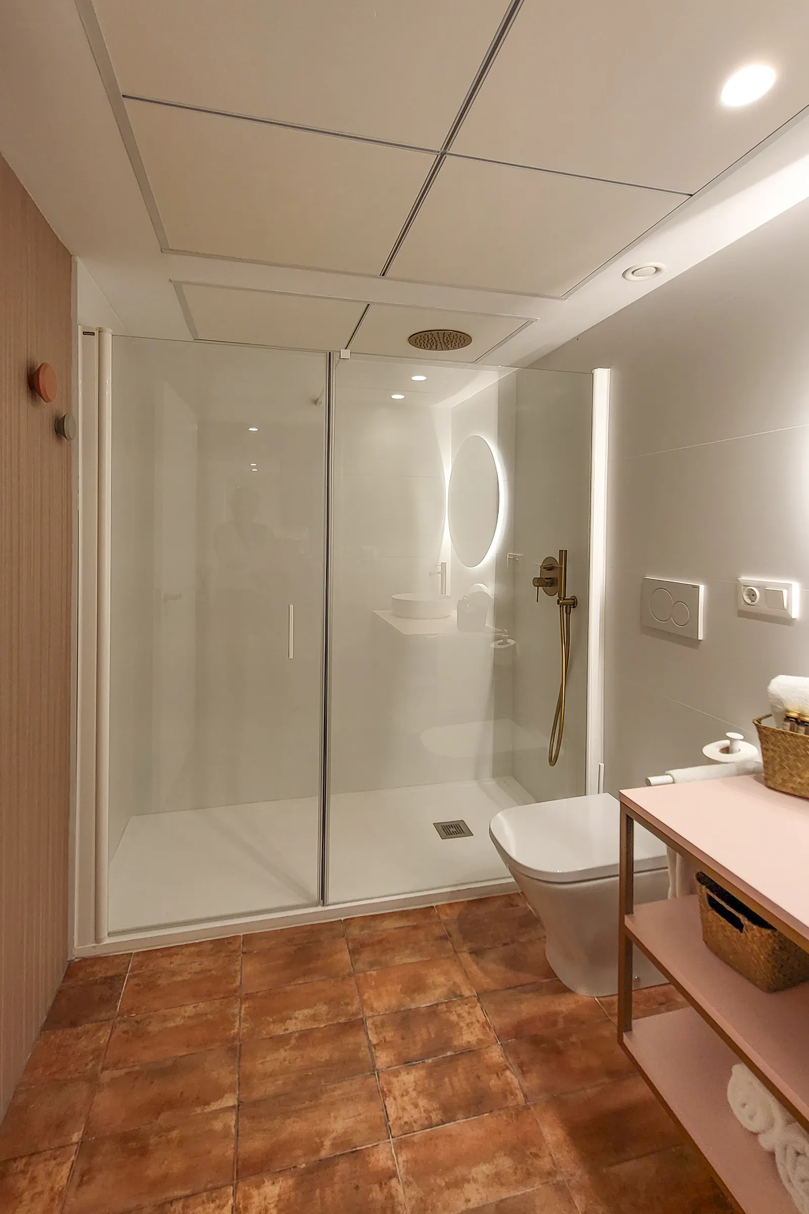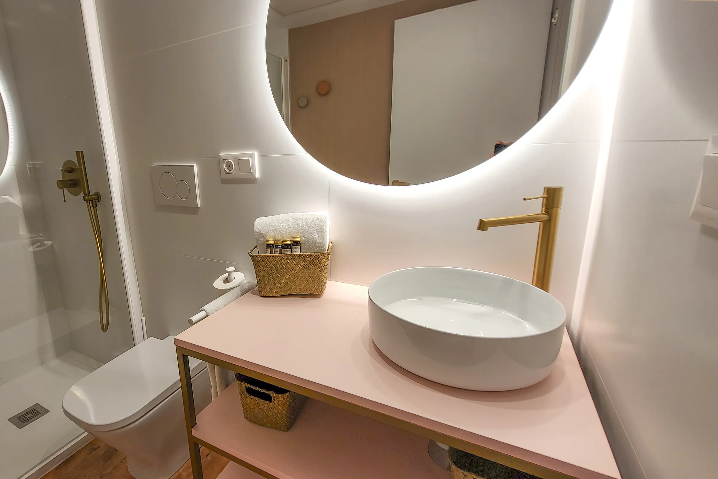 - Design bathroom equipped with shower, toilet and sink.