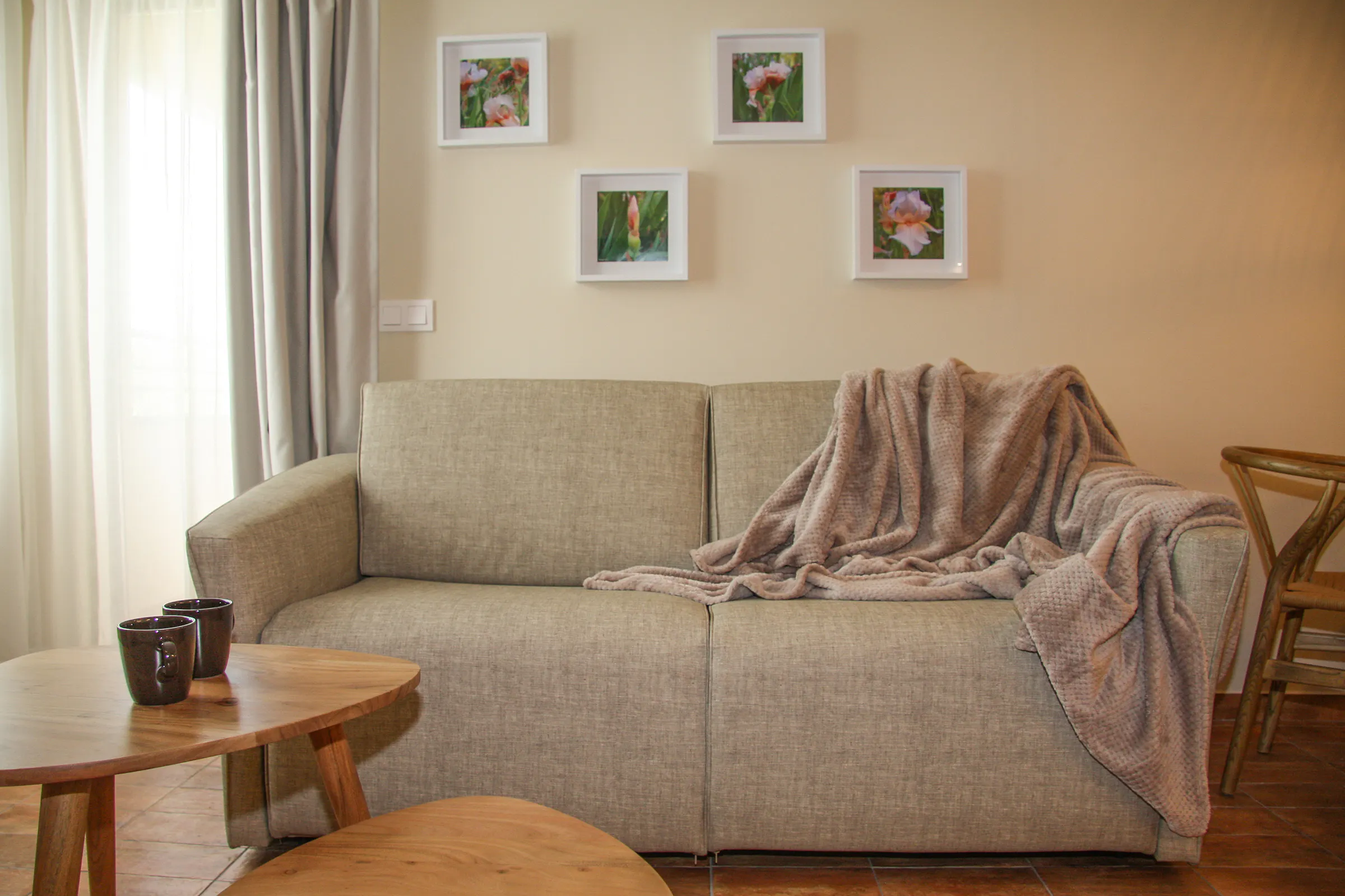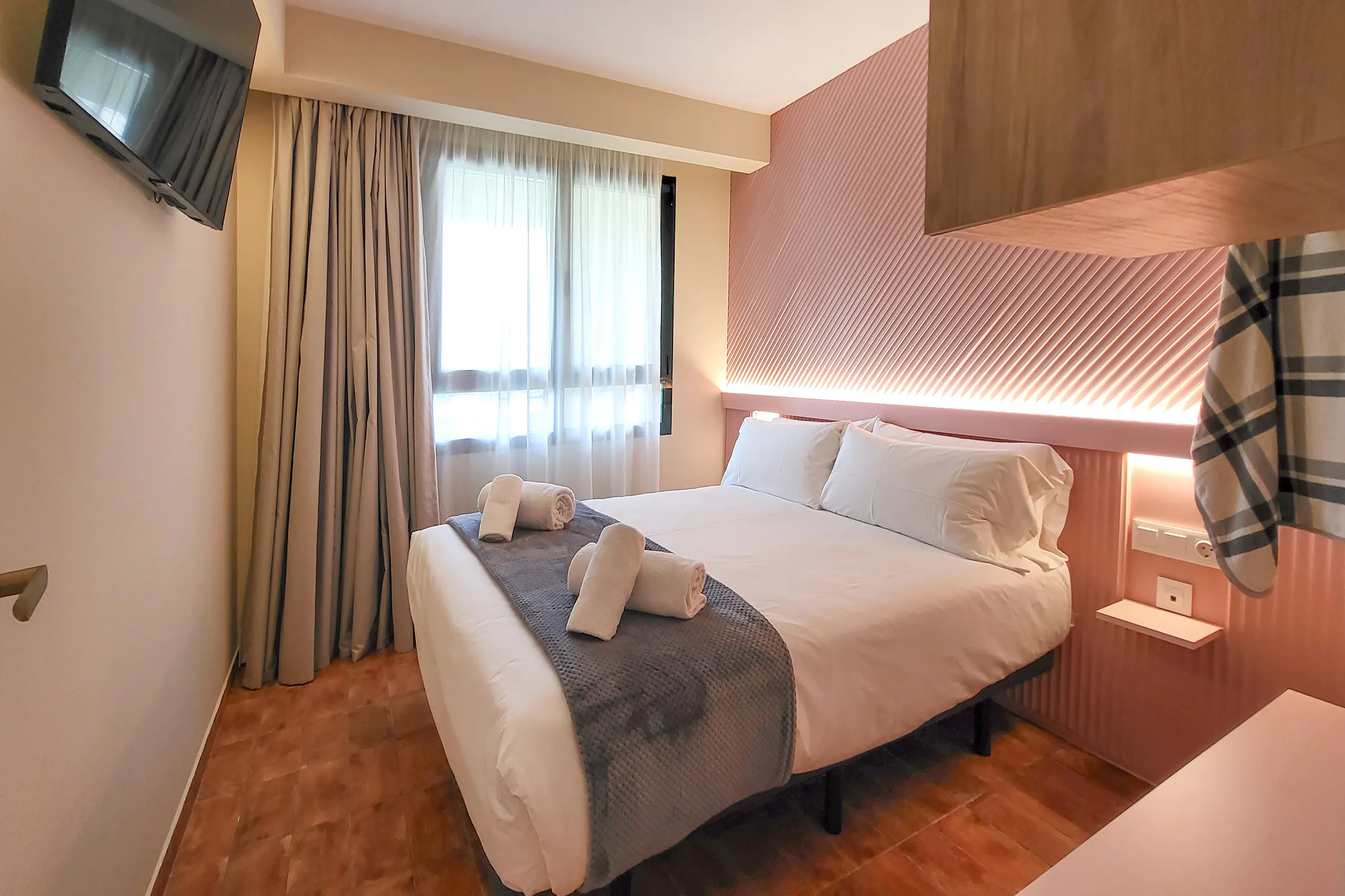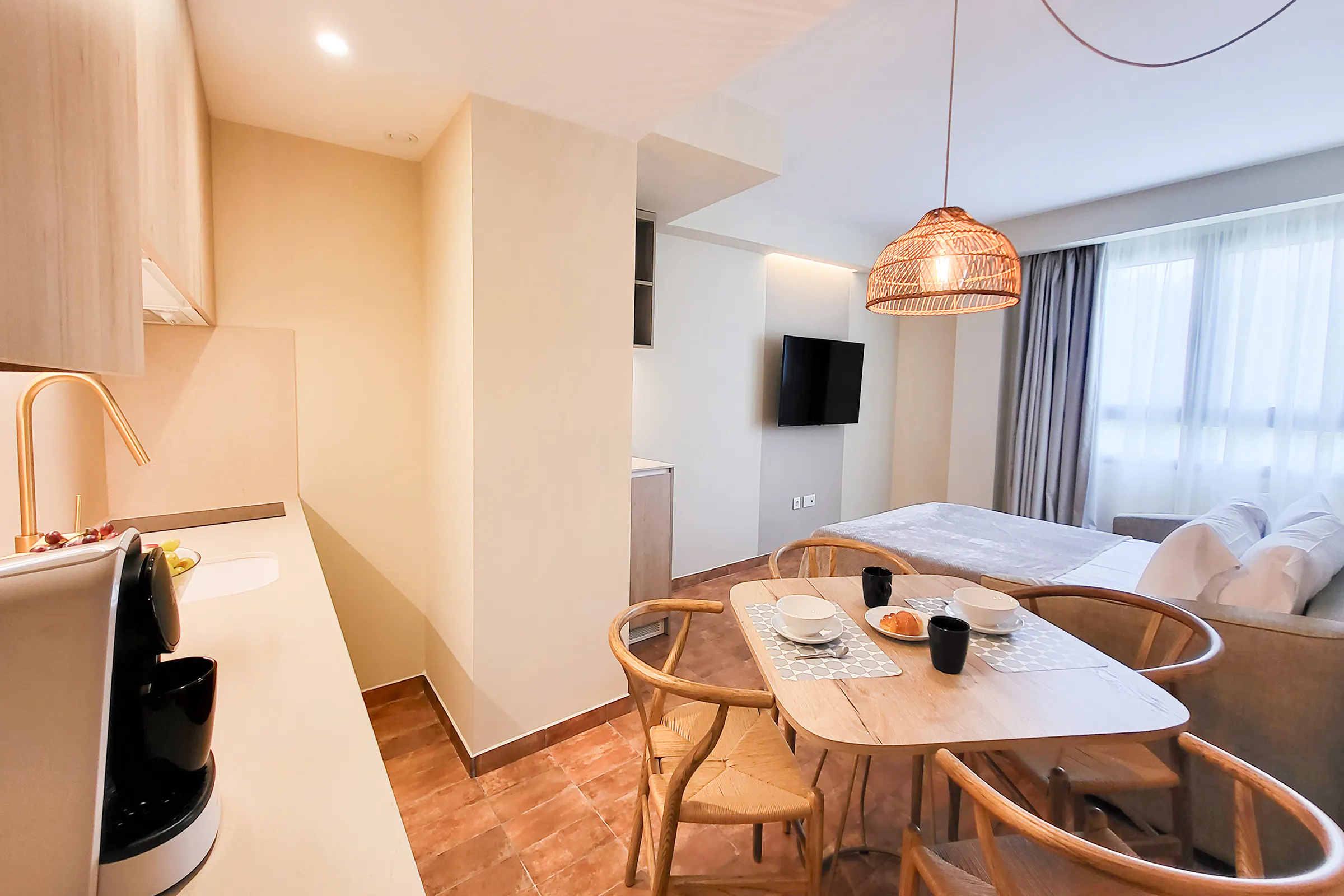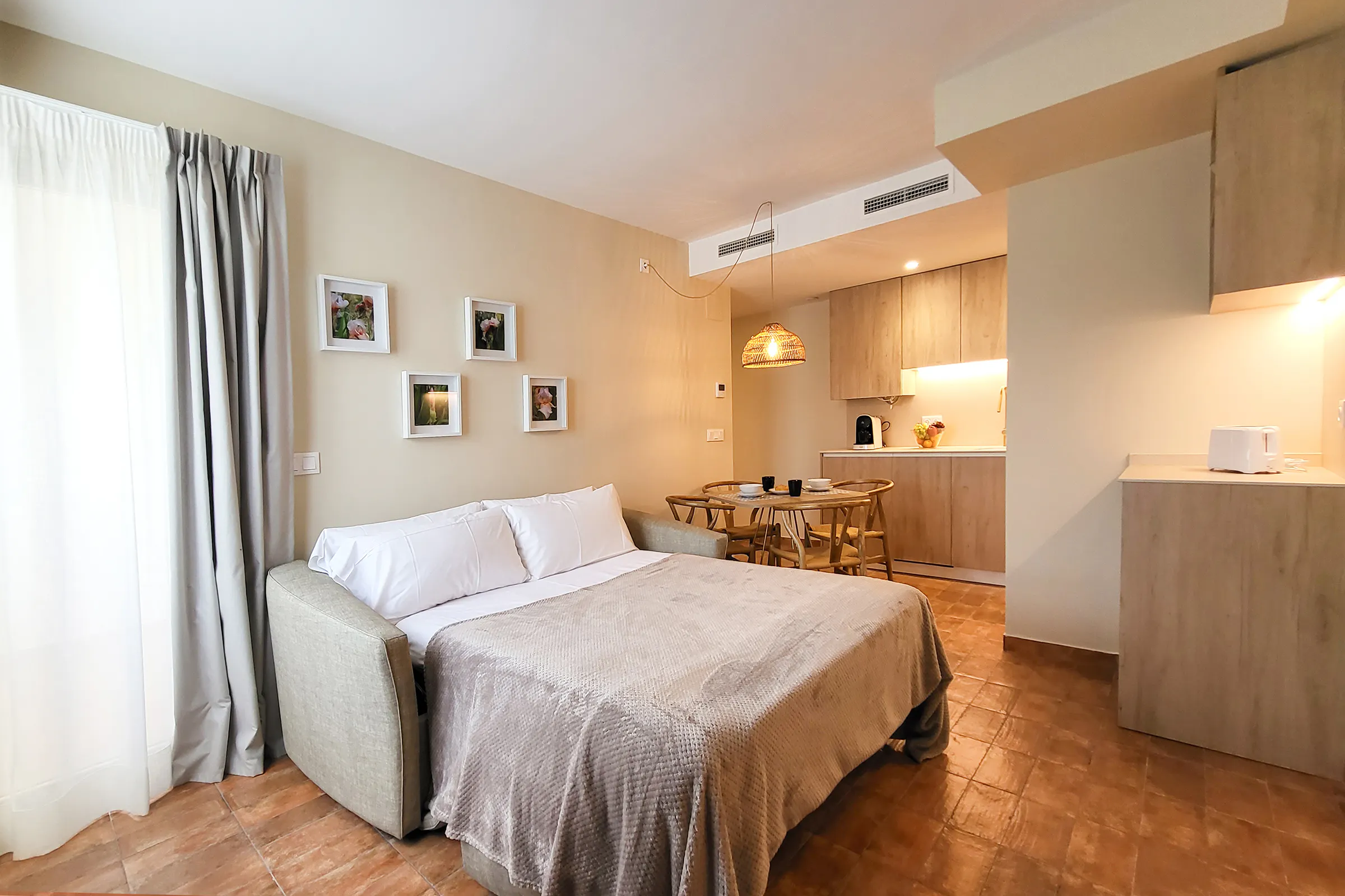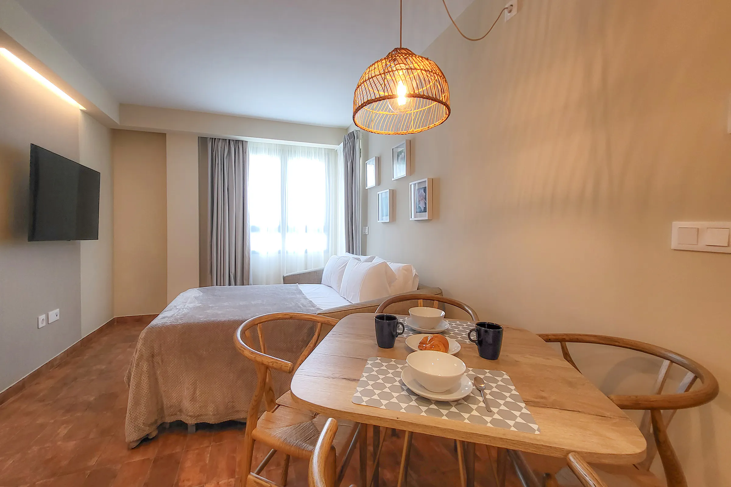 - Living-dining room with a 140x190cm double sofa-bed, dining table, HD TV and access to a balcony.