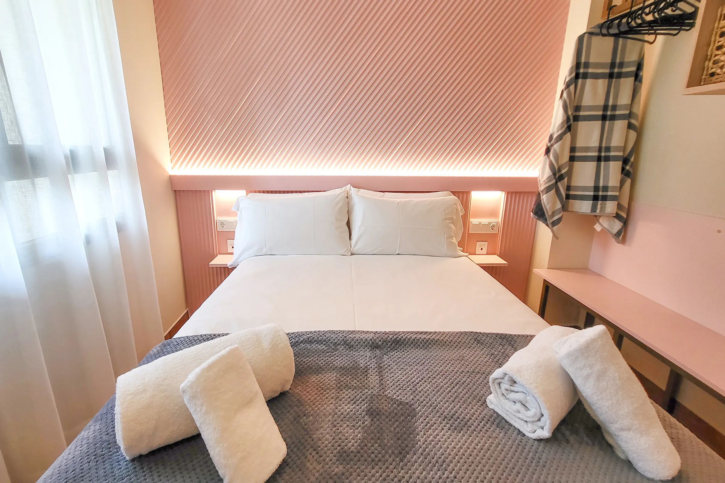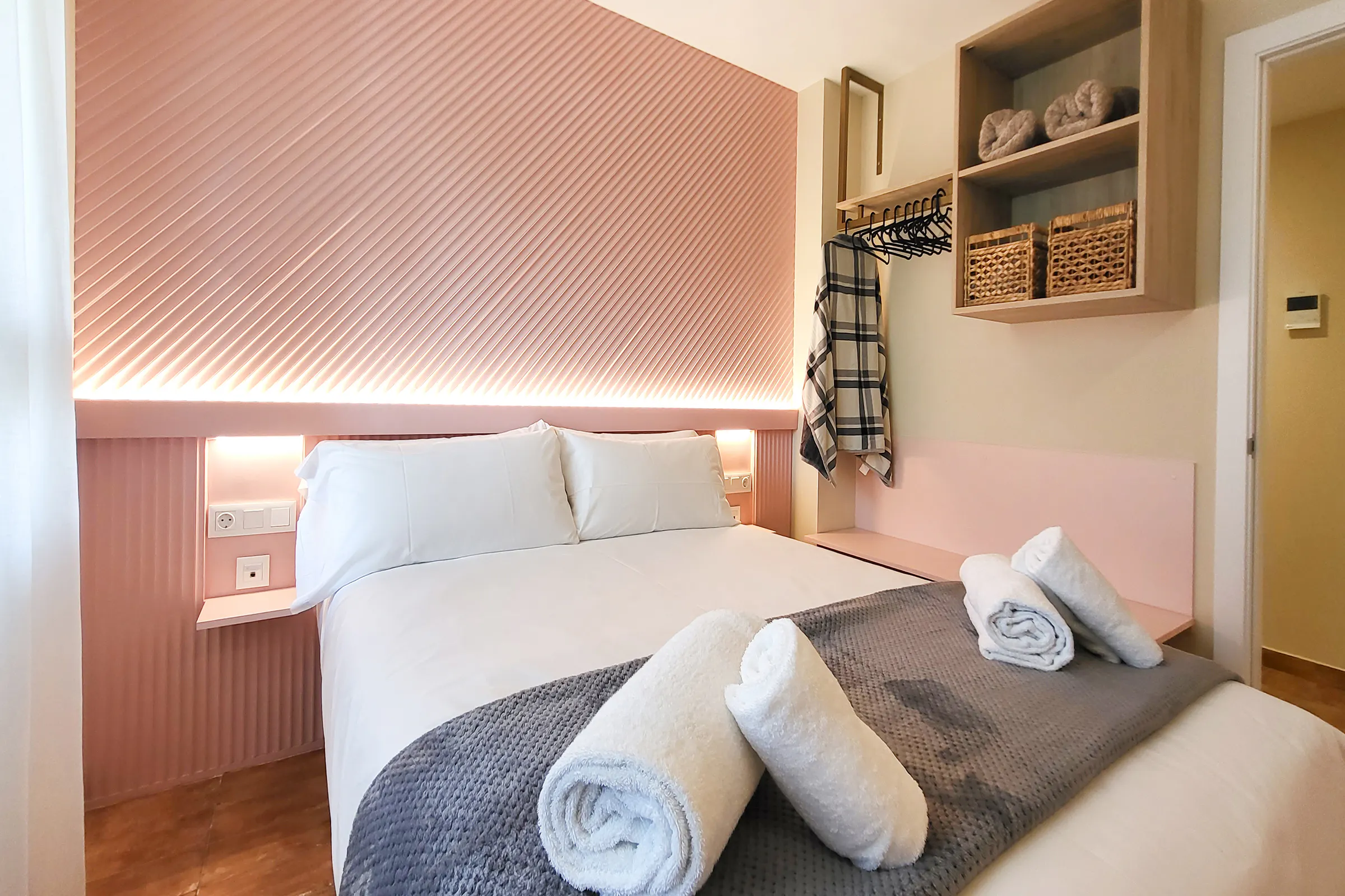 It is delivered with bed linen, 1 hand and bath towel per person, iron and ironing board, hair dryer and welcome kitchen amenities (1 scourer, 1 kitchen towel, 2 garbage bags, 1 washing machine soap, dishwasher , 2 toilet rolls per bathroom, hand gel).