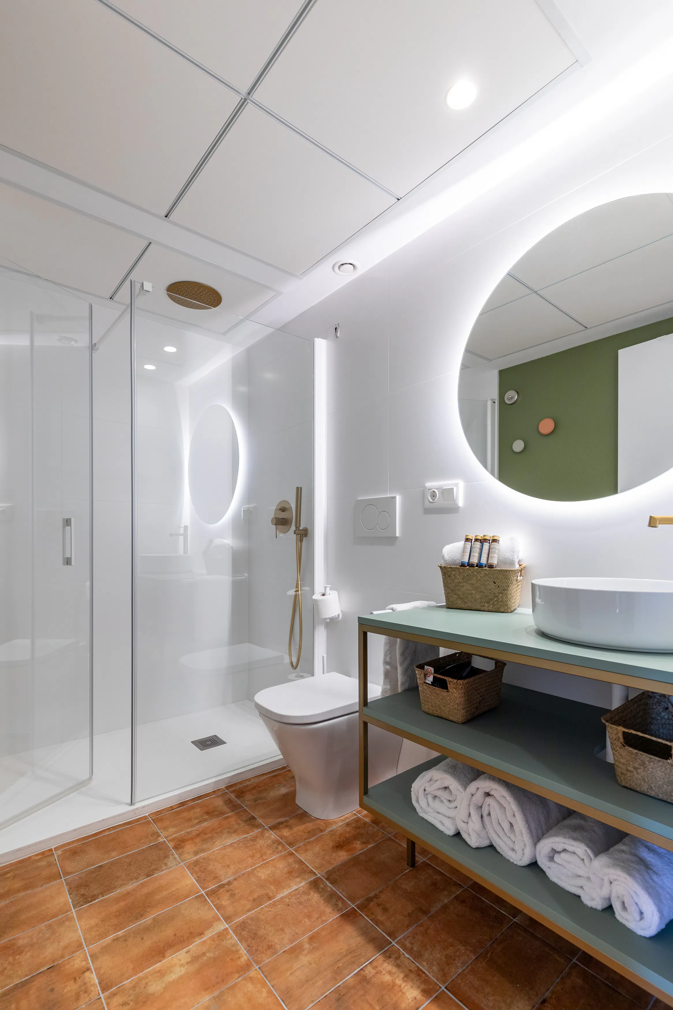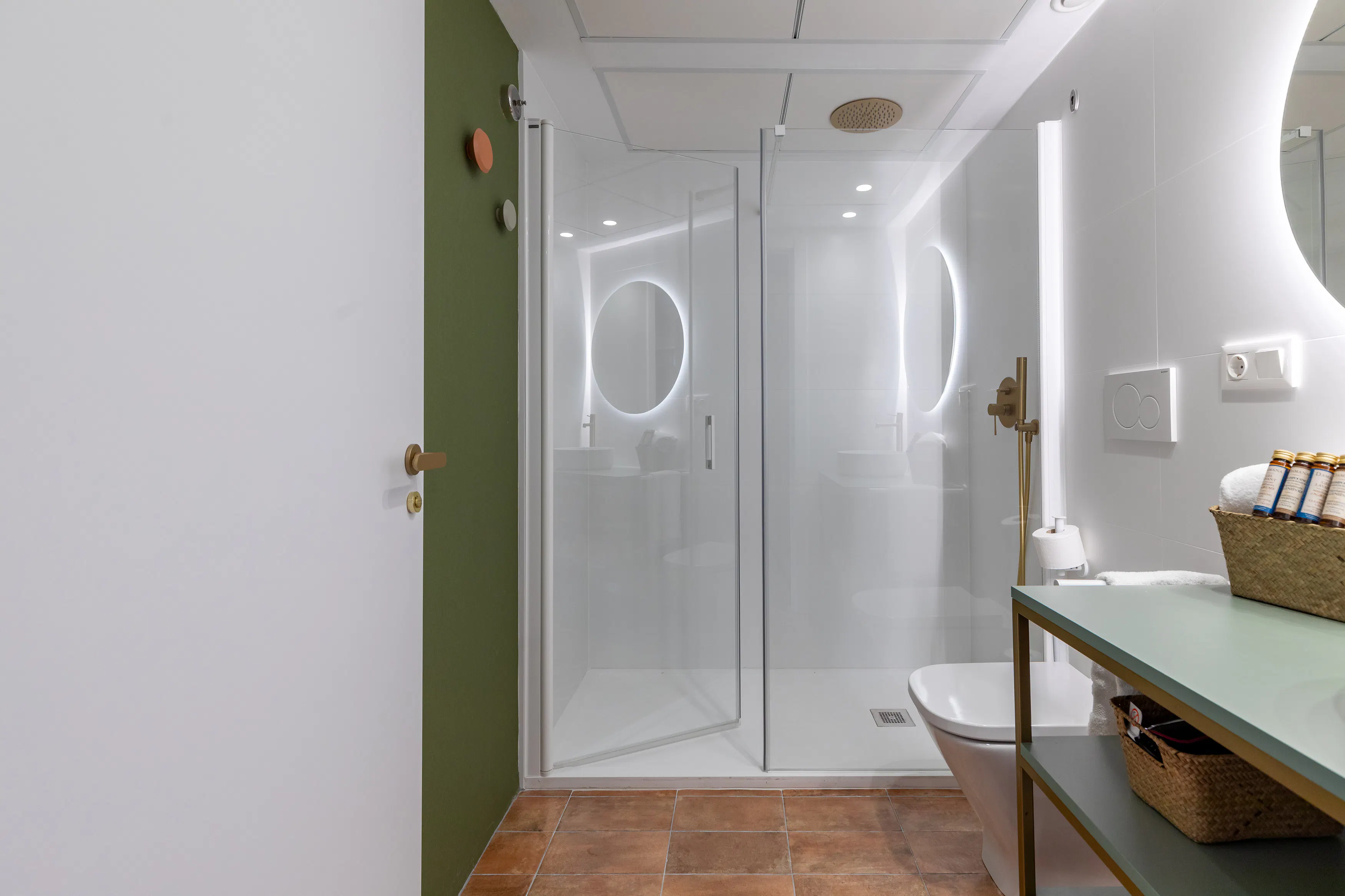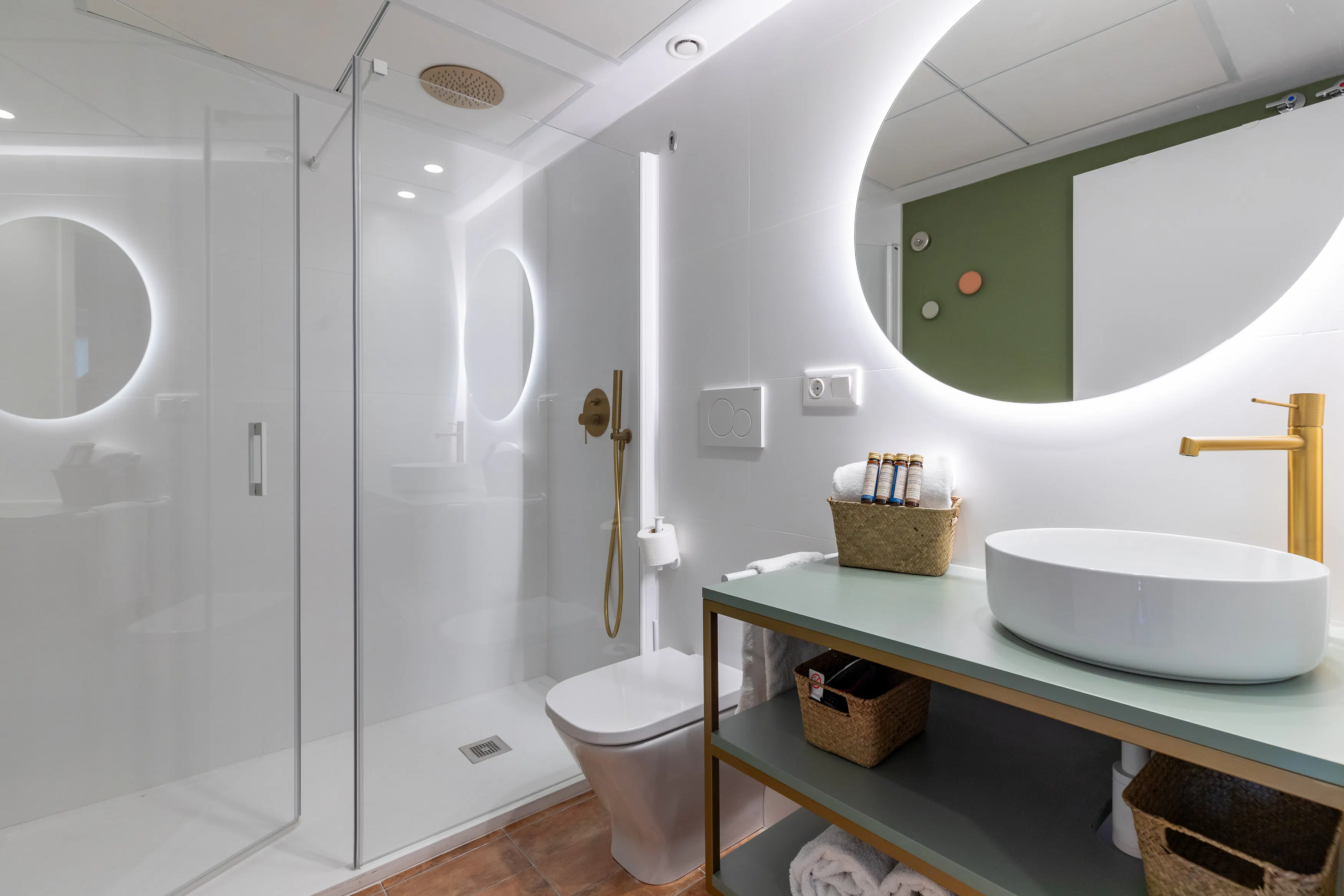 - Design bathroom equipped with shower, toilet and sink.