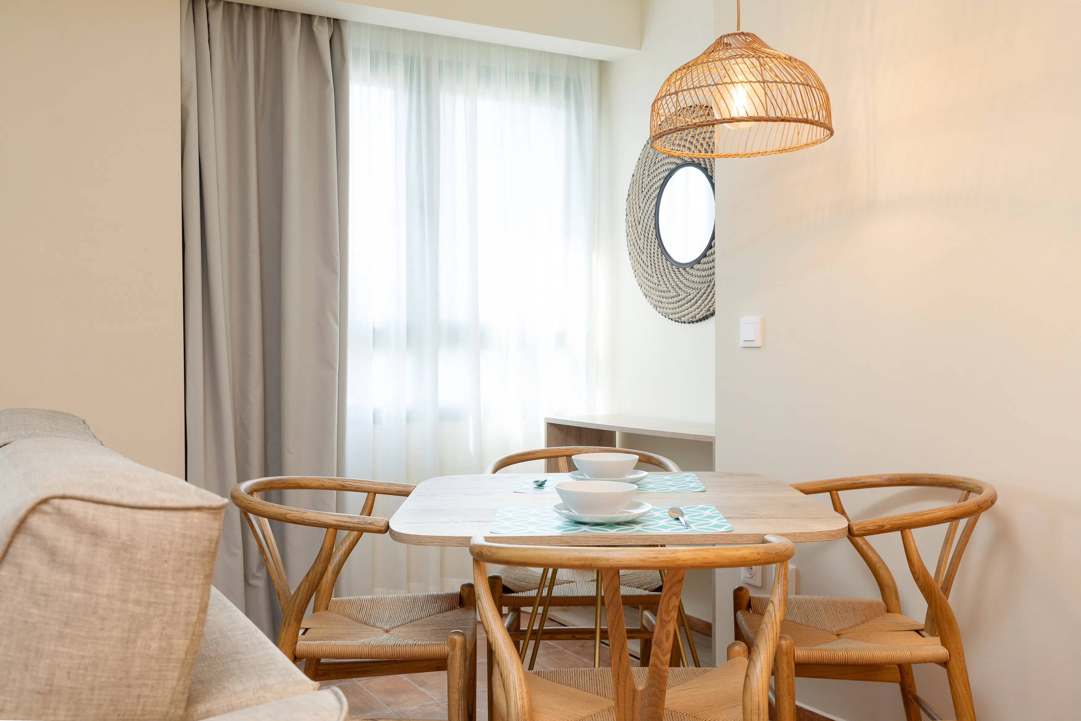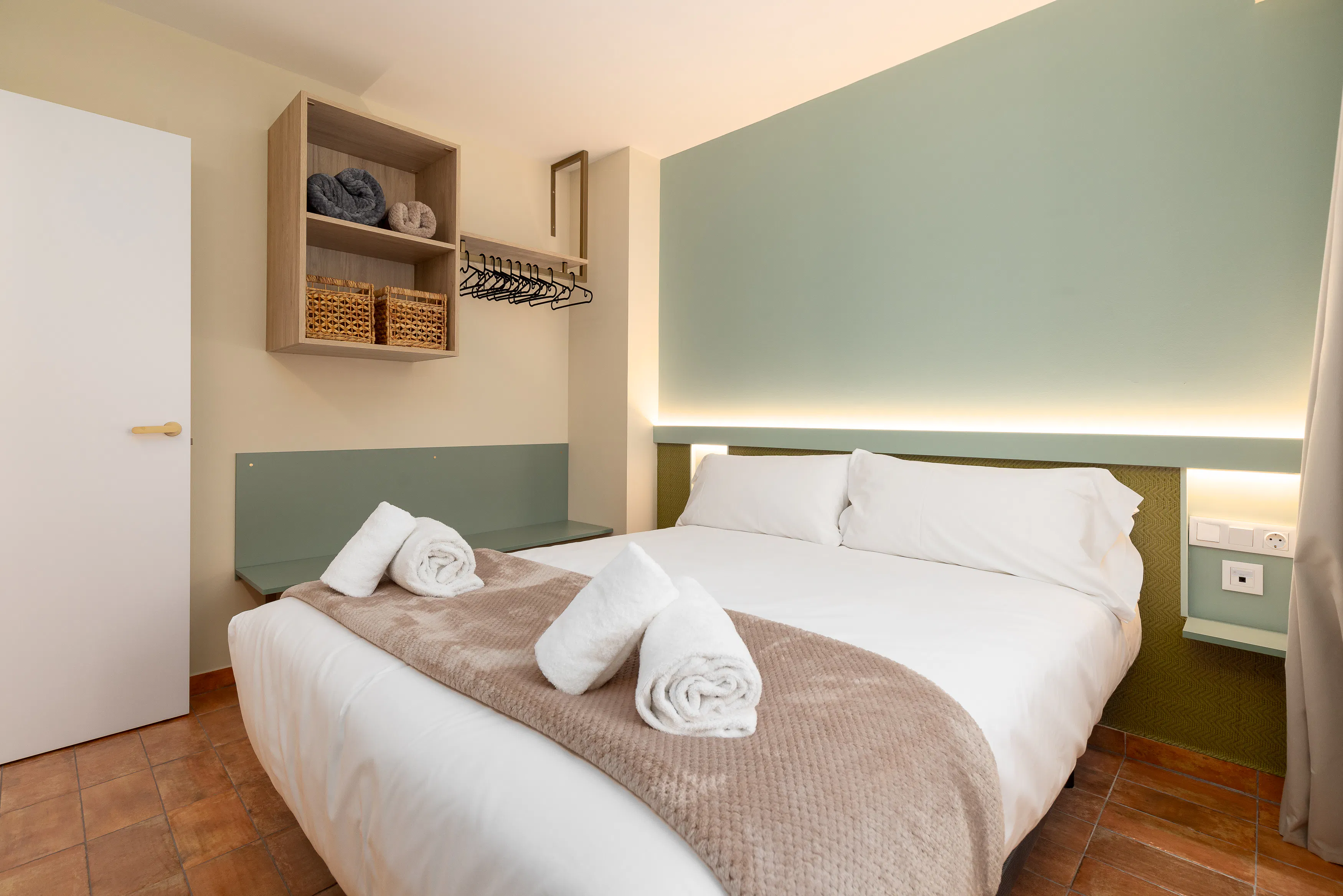 It is delivered with bed linen, 1 hand towel and 1 bath towel per person, iron and ironing board, hair dryer, welcome kitchen amenities: (1 scouring pad, 1 kitchen towel, 2 garbage bags, 1 washing machine soap, dishwasher, 2 toilet rolls per bathroom), bathroom amenities: (shampoo and gel) and coffee capsules and 1.5l water bottle. From mineral water.