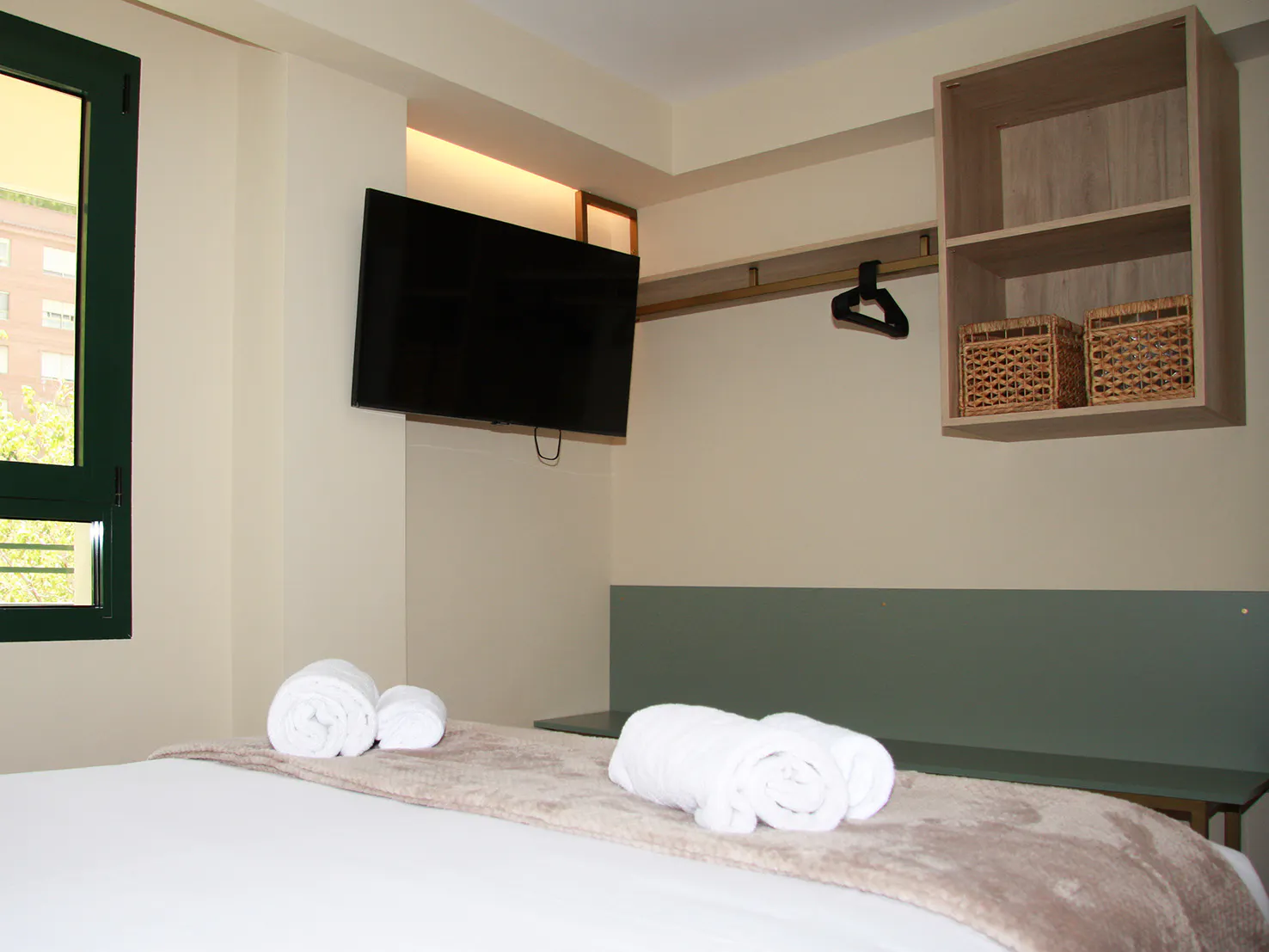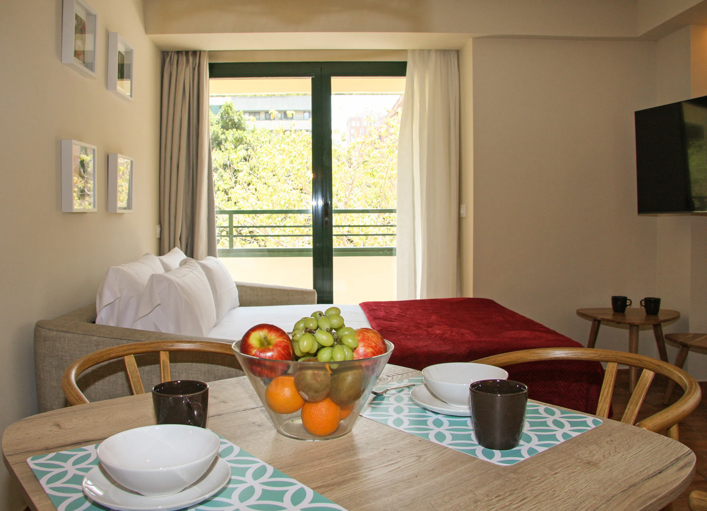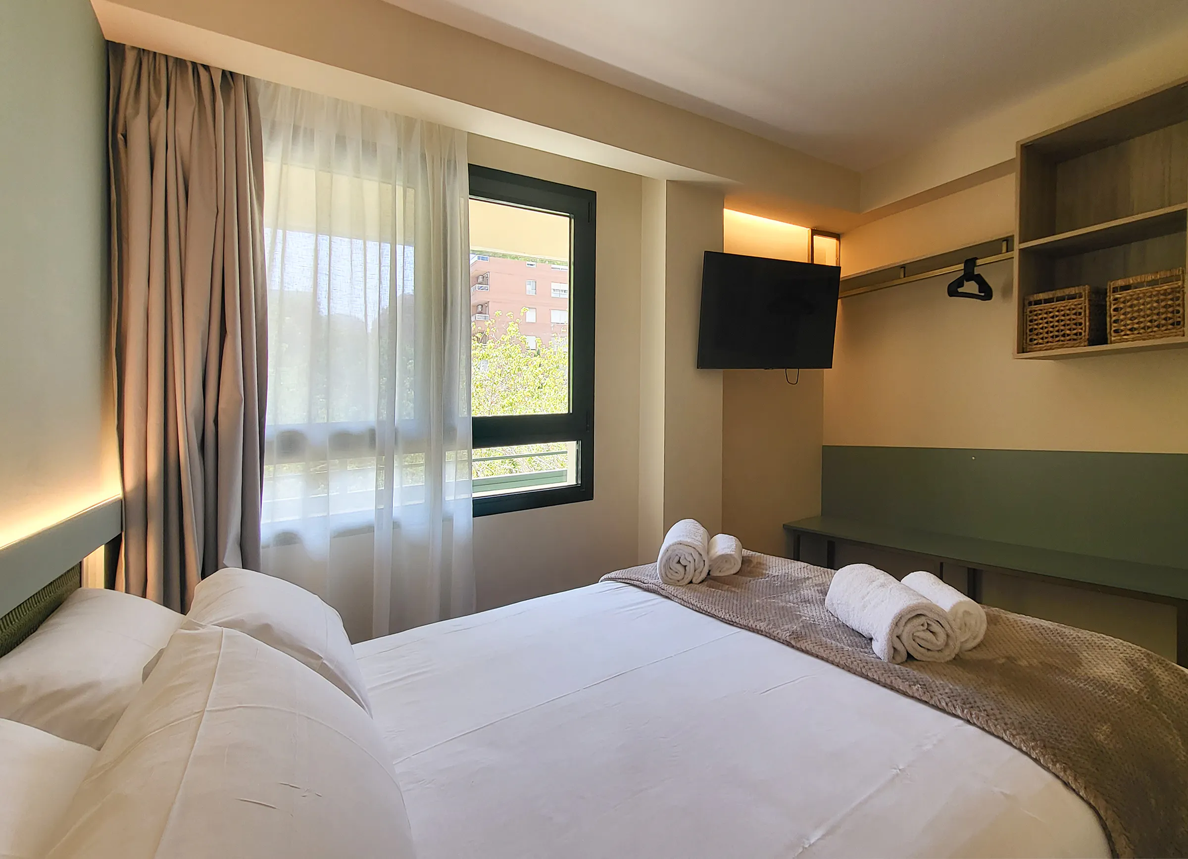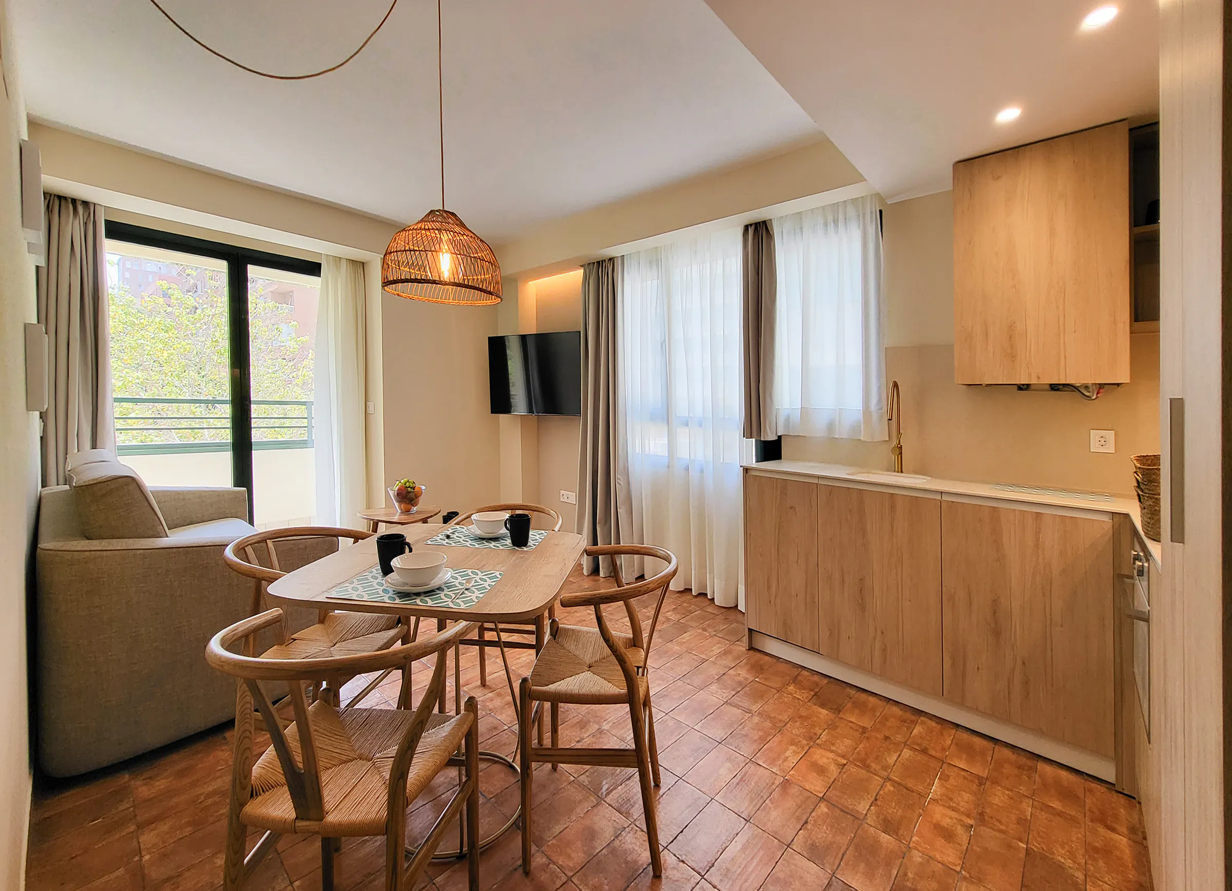 - Living-dining room with 140x190cm double sofa bed, 90x200cm furniture bed, dining table, HD-TV Smart TV and exit to balcony.